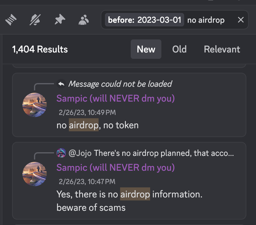 I took a quick peek at their Discord and found that the words “no airdrop” were mentioned 1,404 times before March 1st, 2023.