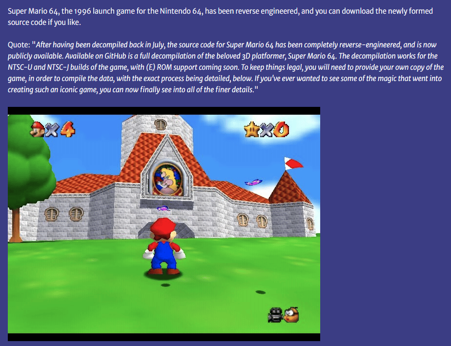 Super Mario 64, a game from 1996, had its source code cracked in the year 2020.